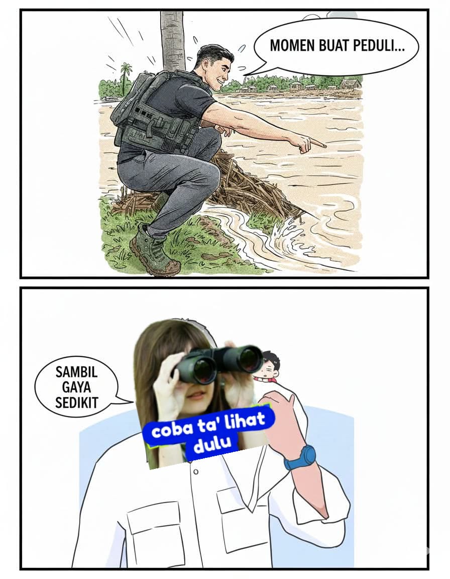 Di lokasi longsor Aceh Tengah, Aceh Singkil, dan beberapa titik di Subulussalam, pejabat hadir dengan rompi baru, sepatu anti-air mengkilap, dan ekspresi prihatin yang nyaris seperti adegan sinetron. Warga sempat bertanya Pak, sepatu itu mau bantu kami atau ikut fashion show bencana?”