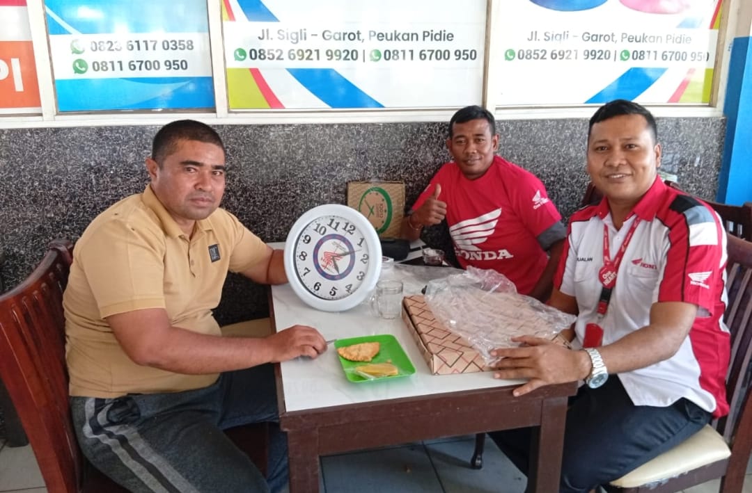 Sigli-Mengawali tahun 2026 dengan semangat kebersamaan dan pelayanan prima, Aiyub, Sales NSS Honda Grong-Grong, menggelar kegiatan berbagi souvenir berupa jam dinding dan kaos kepada para nasabah setia Honda di Komplek SPBU Pulo Pisang, Sigli, Kabupaten Pidie.Senin,12/01/26.