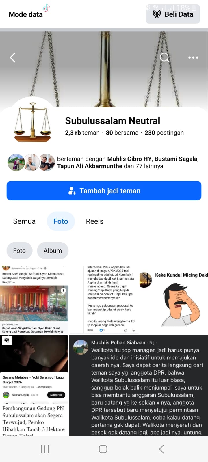 Subulussalam– news1kabar.com Assalamualaikum warahmatullahi wabarakatuh.Atas nama masyarakat Kota Subulussalam, sejumlah warga menyampaikan harapan dan permohonan kepada Kapolres Subulussalam, Muhammad Yusuf, agar kiranya menindaklanjuti keberadaan akun Facebook bernama “Subulussalam Neutral” yang dinilai semakin meresahkan dan memicu kegaduhan di media sosial.