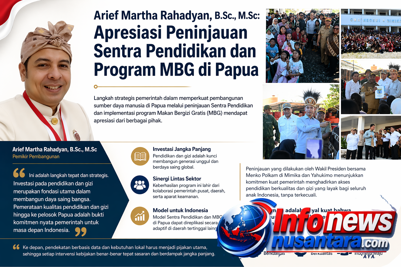 Arief mendorong agar model Sentra Pendidikan dan MBG di Papua dapat direplikasi secara adaptif di berbagai wilayah lain di Indonesia, khususnya daerah tertinggal dan terluar. Ke depan, pendekatan berbasis data dan kebutuhan lokal harus menjadi pijakan utama, sehingga setiap kebijakan benar-benar tepat sasaran dan berdampak jangka panjang,” tuturnya