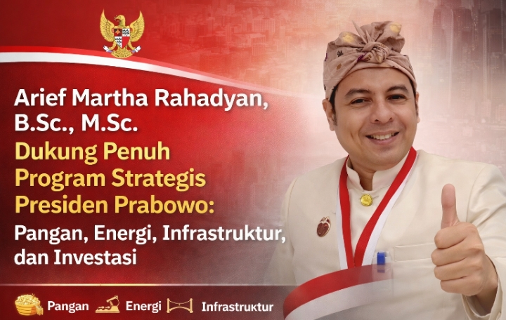 Tokoh muda nasional Arief Martha Rahadyan menyatakan dukungan penuh terhadap arah kebijakan strategis pemerintahan Presiden Prabowo Subianto yang menitik beratkan penguatan sektor pangan, energi, infrastruktur, dan investasi.