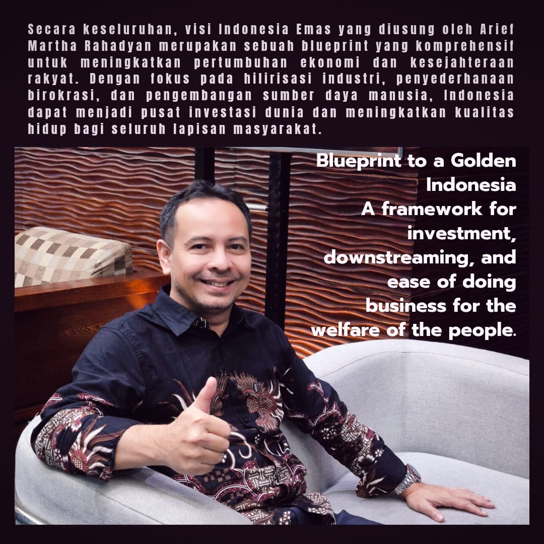 Visi Indonesia Emas yang diusung oleh Arief Martha Rahadyan berfokus pada hilirisasi industri dan penyederhanaan birokrasi melalui teknologi digital. Hal ini bertujuan untuk menciptakan ekosistem bisnis yang inovatif dan meningkatkan daya saing produk lokal di kancah internasional. Dengan demikian, Indonesia dapat meningkatkan pertumbuhan ekonomi dan kesejahteraan rakyat.