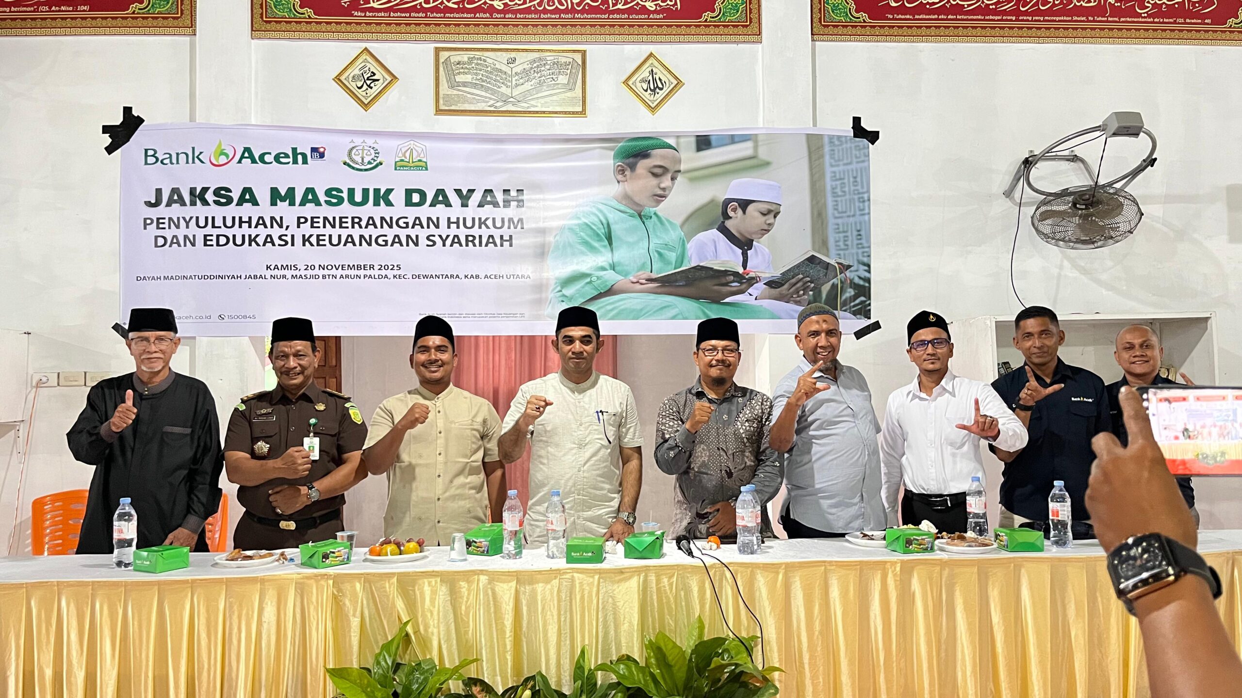 Program Jaksa Masuk Dayah kembali digelar dan kali ini menyapa para santri di Dayah Darussa’dah Cot Tarom, Bireuen, serta Madinatuddiniyah Paloh Lada, Aceh Utara, Kamis (20/11/2025). Kegiatan edukatif ini menggandeng Bank Aceh Syariah sebagai mitra, menghadirkan tiga pemateri utama: Tgk. Syekh Muhsin, S.Pd.I., M.Pd.I. selaku Sekretaris Dinas Pendidikan Dayah Aceh, Ali Rasab Lubis, S.H. selaku Kepala Seksi Penerangan Hukum Kejaksaan Tinggi Aceh, serta perwakilan Bank Aceh Syariah dari Cabang Bireuen dan Samudera.