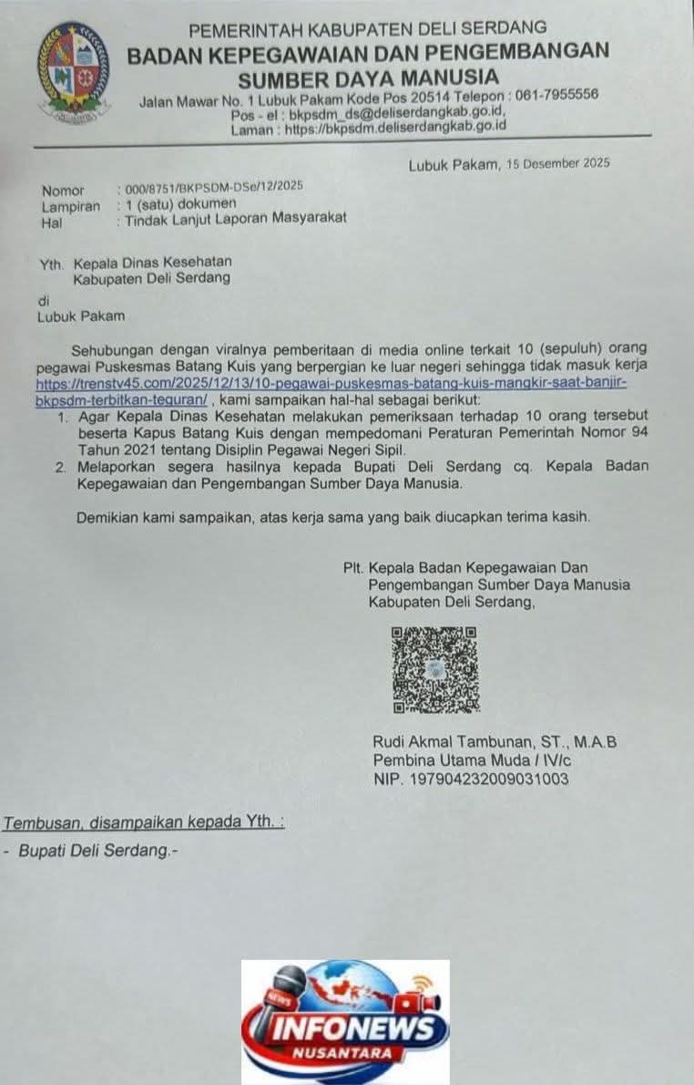 Permintaan Badan Kepegawaian dan Pengembangan Sumber Daya Manusia (BKPSDM) Kabupaten Deli Serdang tersebut tertuang dalam surat bernomor : 000/8751/BKPSDM-DSe/12/2025 tertanggal 15 Desember 2025, yang ditujukan kepada Kepala Dinas Kesehatan Kabupaten Deli Serdang. Surat ini merupakan tindak lanjut atas laporan masyarakat serta pemberitaan media online terkait dugaan sejumlah Pegawai Puskesmas Kecamatan Batang Kuis yang melakukan perjalanan ke luar Negeri sehingga tidak melaksanakan tugas kedinasan.