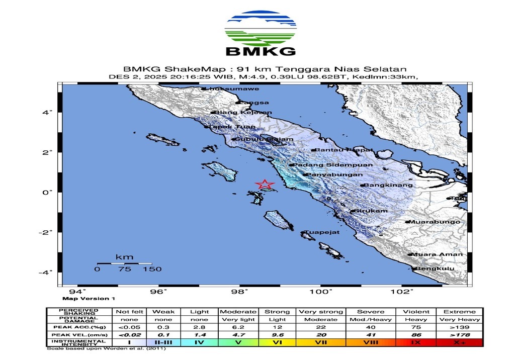 MEDAN | Gempa bumi tektonik mengguncang di wilayah Kabupaten Nias Selatan, Selasa (02/12/2025) sekira pukul 20.16 WIB. Berdasarkan hasil analisis Badan Meteorologi, Klimatologi, dan Geofisika (BMKG), gempa ini memiliki magnitudo terkini M4,9 dengan pusat gempa berada di laut.