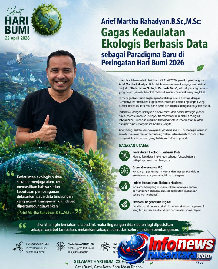 Momentum Hari Bumi pada 22 April 2026 dimaknai secara berbeda oleh Arief Martha Rahadyan. Dalam sebuah pernyataan strategis, Arief memperkenalkan konsep baru bertajuk “Kedaulatan Ekologis Berbasis Data”, sebuah pendekatan yang belum banyak diangkat dalam diskursus nasional maupun global.