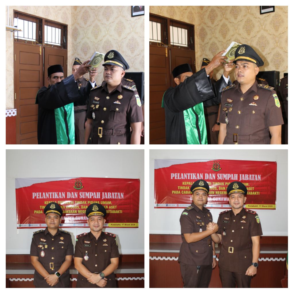 Kotabakti-Cabang Kejaksaan Negeri Pidie di Kotabakti melaksanakan kegiatan Pengambilan Sumpah dan Pelantikan Kepala Sub Seksi Tindak Pidana Umum (Pidum), Tindak Pidana Khusus (Pidsus), serta Pemulihan Aset. Aditya Gunawan, S.H., M.H., secara resmi dilantik dan dipercaya mengemban amanah jabatan dengan penuh tanggung jawab. Selasa,17/03/26.