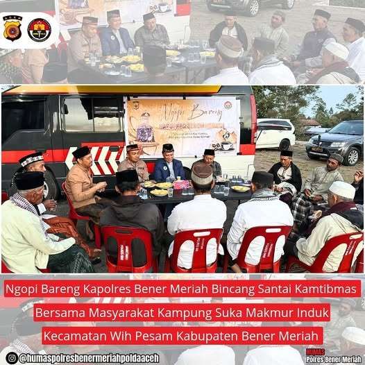 Dalam upaya memperkuat kemitraan antara Polri dan masyarakat, Kapolres Bener Meriah AKBP Aris Cai Dwi Susanto, S.I.K., M.I.K., bersama para Pejabat Utama (PJU) Polres Bener Meriah menggelar kegiatan Ngopi Bareng bersama tokoh masyarakat di Kampung Suka Makmur Induk, Kecamatan Wih Pesam, Rabu (29/10/2025) pagi.