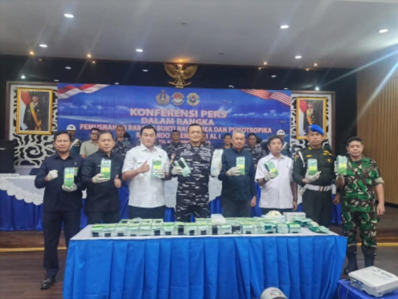 Kodaeral I Belawan Gelar Press Release Musnahkan Barang Bukti Narkotika Jenis Ketamine Seberat 41,7 Kilogram dan Psikotropika, TNI AL dalam Tindak Penyelundupan Narkoba Jalur Laut serta Perkuat Keamanan Perairan Yurisdiksi Nasional