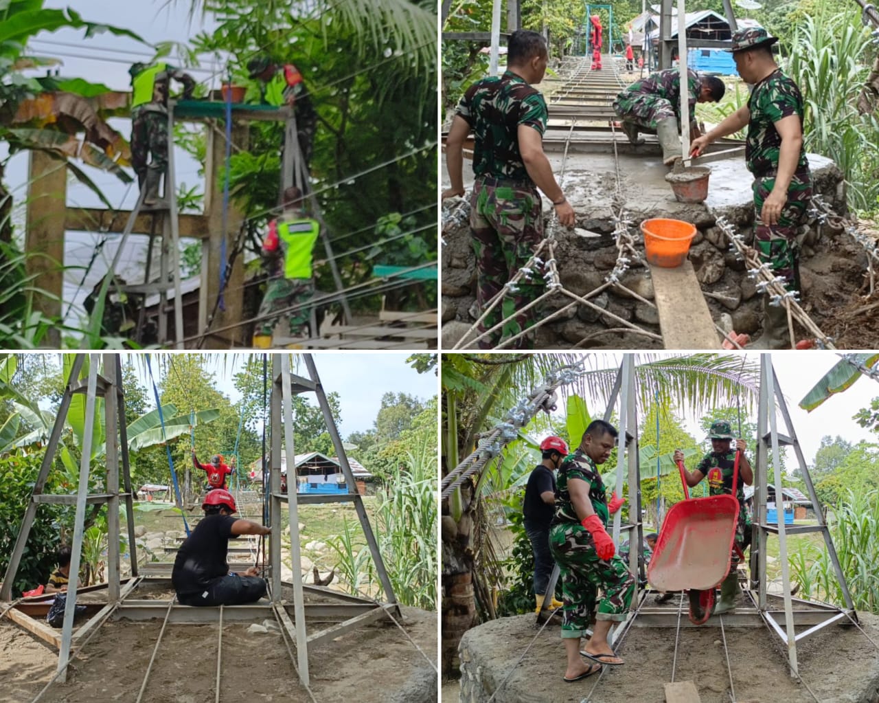 Bandar Baru- Pengerjaan jembatan gantung di Desa Ara, Kecamatan Bandar Baru, Kabupaten Pidie Jaya terus berlanjut dengan semangat gotong royong yang tinggi. Kodim 0102/Pidie melalui Koramil 11/Bandar Baru bersama TNI, VRI, dan masyarakat setempat terus bekerja keras untuk menyelesaikan proyek ini.Selasa,30 Desember 2025