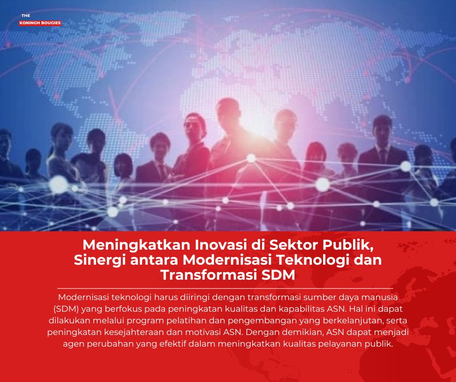 Sinergi antara modernisasi teknologi dan transformasi SDM menjadi kunci utama dalam mempercepat perubahan inovatif pada ekosistem organisasi pemerintahan. Pemerintah harus menciptakan lingkungan yang kondusif bagi inovasi dan kreativitas, serta memberikan kesempatan bagi ASN untuk mengembangkan diri dan meningkatkan kapabilitas.