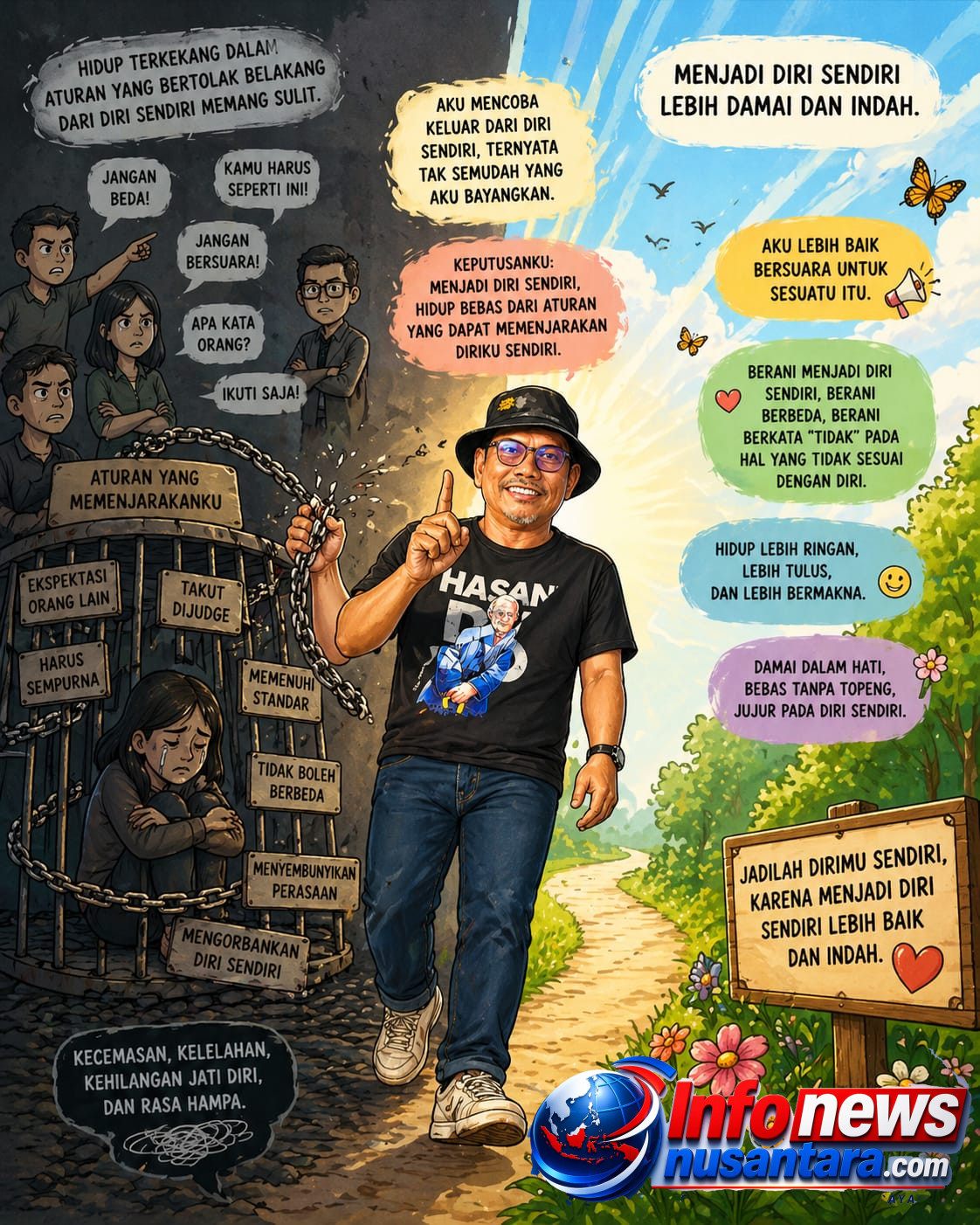 Keputusan untuk menjadi diri sendiri bukanlah keputusan yang mudah. Ia sering kali diiringi risiko: penolakan, kritik, bahkan kehilangan. Namun, di balik semua itu, terdapat kebebasan yang tidak ternilai. Kebebasan untuk berpikir, berbicara, dan bertindak sesuai dengan apa yang kita yakini. Kebebasan untuk hidup tanpa topeng, tanpa kepura-puraan.