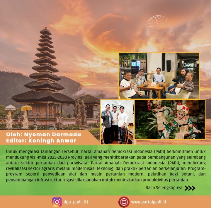Untuk mengatasi tantangan tersebut, Partai Amanah Demokrasi Indonesia (PADI) berkomitmen untuk mendukung visi-misi 2025-2030 Provinsi Bali yang menitikberatkan pada pembangunan yang seimbang antara sektor pertanian dan pariwisata. Partai Amanah Demokrasi Indonesia (PADI), mendukung revitalisasi sektor agraris melalui modernisasi teknologi dan praktik pertanian berkelanjutan. Program-program seperti penyediaan alat dan mesin pertanian modern, pelatihan bagi petani, dan pengembangan infrastruktur irigasi dilaksanakan untuk meningkatkan produktivitas pertanian.
