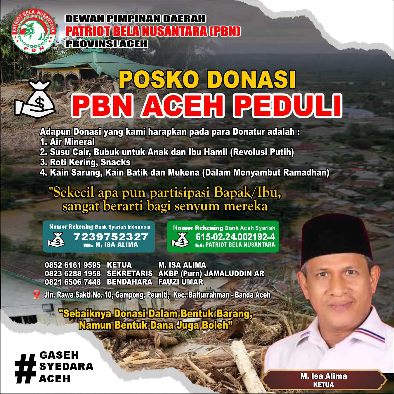 DPD Patriot Bela Nusantara (PBN) Aceh kembali merajut asa bagi saudara-saudara yang terenggut kebahagiaannya oleh bencana alam. Ketua DPD PBN Aceh, Drs. Isa Alima, dengan hati tulus menginisiasi gerakan open donasi kemanusiaan, mengajak seluruh masyarakat untuk bersama-sama memulihkan senyum para korban banjir bandang dan tanah longsor yang melanda bumi Aceh.