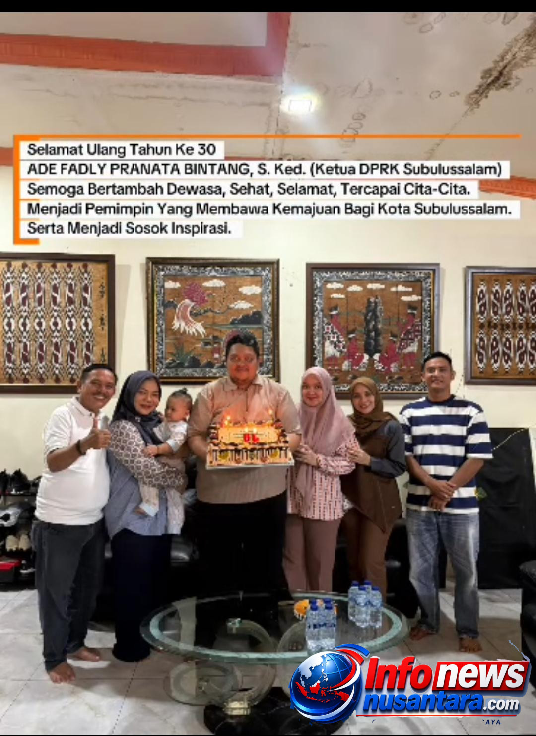 Subulussalam —infonewsnusantara.com Suasana hangat dan penuh kebersamaan terlihat dalam momen perayaan ulang tahun ke-30 Ketua DPRK Subulussalam, Ade Fadly Pranata Bintang, S. Ked. Perayaan sederhana namun bermakna ini dihadiri oleh keluarga dan orang-orang terdekat yang memberikan kejutan serta doa terbaik bagi sosok pemimpin muda tersebut.