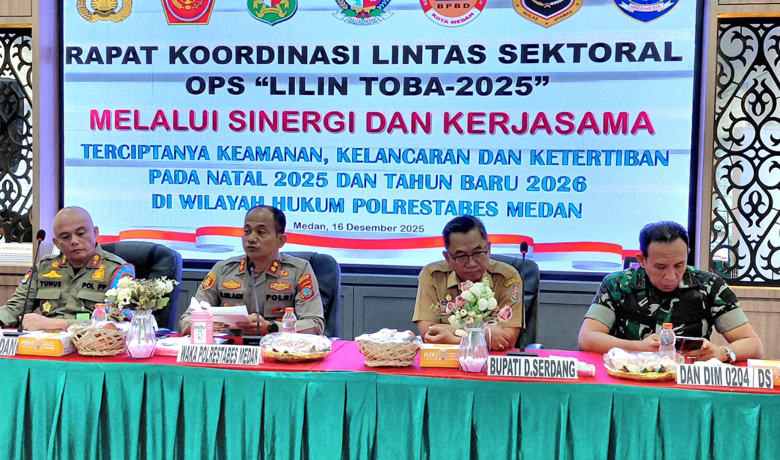 “Dengan demikian dengan adanya Pos Pengamanan (PAM) tersebut dapat penanganan terhadap kemungkinan kejadian seperti angin kencang, tanah longsor, dan banjir dapat dilakukan secara cepat dan tepat,” kata Bupati Deli Serdang, dr. H. Asri Ludin Tambunan diwakili Asisten I Pemerintahan dan Kesejahteraan Rakyat, Drs. Zainal Abidin Hutagalung, MAP di Rapat Koordinasi Lintas Sektoral Kesiapan Pengamanan Natal 2025 dan Tahun Baru 2026 (Nataru) di Aula Patriatama, Lantai II, Mapolrestabes Medan, Selasa (16/12/2025).