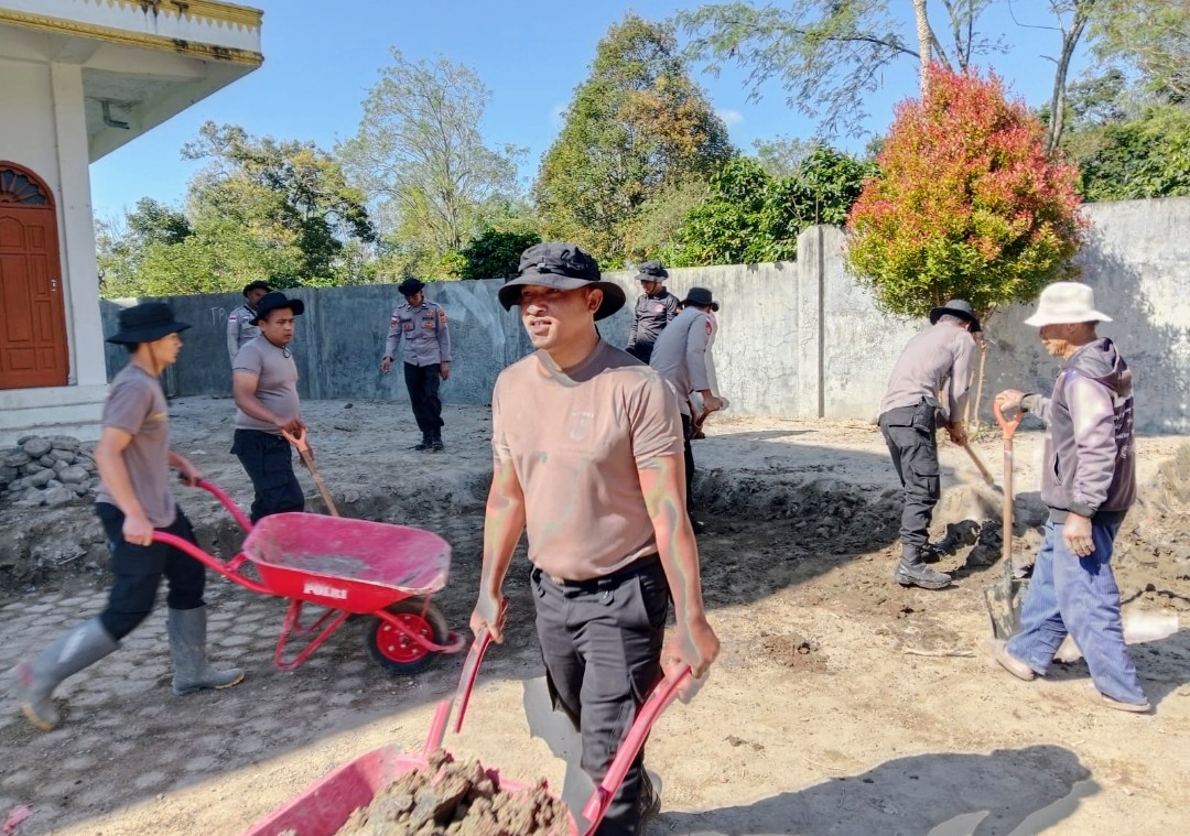 Selama pelaksanaan bakti sosial, personel Polres Bener Meriah bersama warga bahu-membahu membersihkan tanah yang menimbun samping dan halaman Masjid Syuhada hingga kegiatan selesai.
