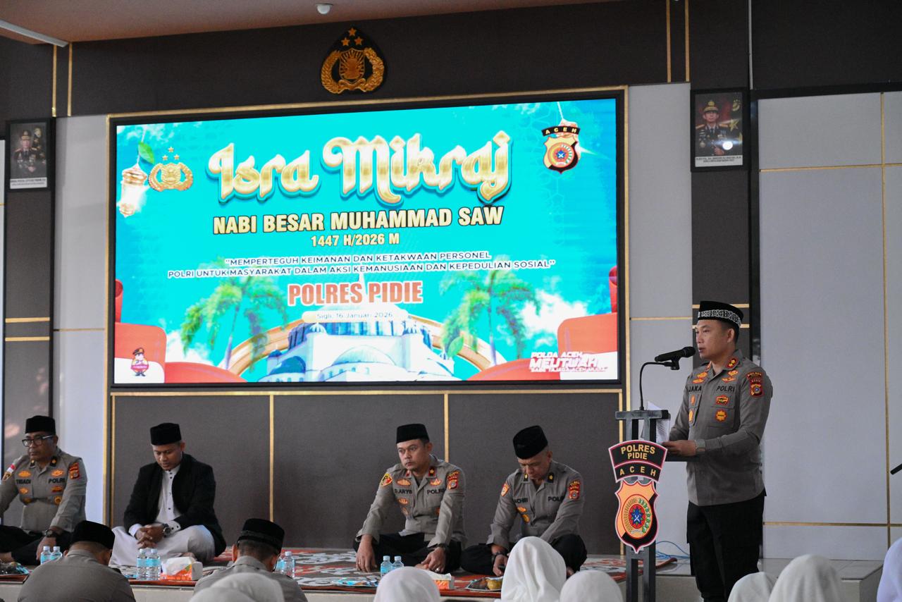 Sigli – Polres Pidie Polda Aceh melaksanakan peringatan Isra Mikraj Nabi Muhammad SAW 1447 Hijriah/2026 Masehi yang berlangsung di Aula Wira Satya Polres Pidie, Jumat (16/1/2026). Kegiatan ini dirangkaikan dengan pemberian santunan kepada anak yatim sebagai bentuk kepedulian sosial Polri terhadap masyarakat.
