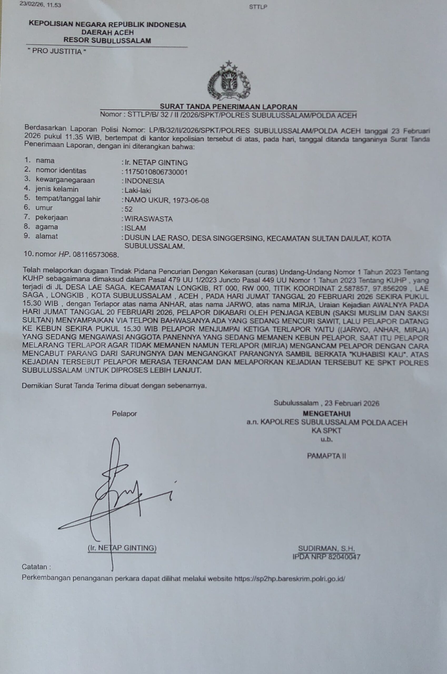 Sudah Lebih Dulu Melapor ke Polisi Netap menyatakan pihaknya telah lebih dahulu melaporkan dugaan pencurian hasil panen dan pengancaman tersebut ke Polres Subulussalam. Ia berharap aparat penegak hukum dapat bekerja profesional, objektif, dan tidak terpengaruh opini liar yang berkembang.