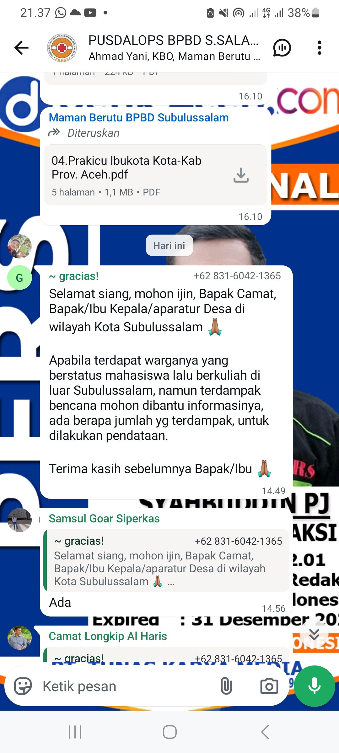 Subulussalam | infonewsnusantara.com. Dampak bencana banjir yang melanda sejumlah wilayah tidak hanya dirasakan oleh warga di daerah asal, tetapi juga oleh mahasiswa asal Kota Subulussalam yang tengah menempuh pendidikan di luar daerah. Informasi ini dihimpun berdasarkan laporan yang masuk melalui Grup WhatsApp Pusdalops BPBD Kota Subulussalam, Rabu (18/12).