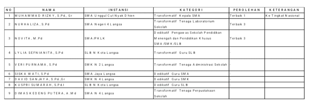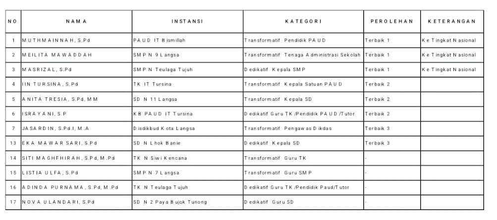 Adapun PTK terbaik Kota Langsa jenjang PAUD/TK SD dan SMP serta Pengawas Dikdas yang berkompetisi di tingkat provinsi antara lain: