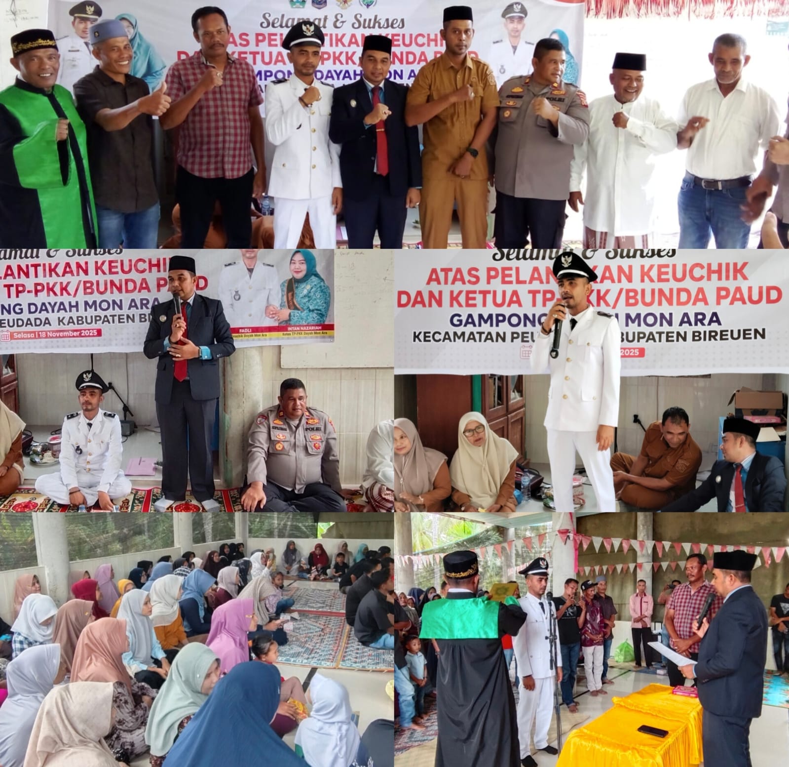Ratusan kaum ibu-ibu turut memadati Meunasah Gampong Dayah Mon Ara, Kecamatan Peudada, pada Selasa (18/11/2025) dalam rangka menghadiri acara pelantikan Keuchik Fadli untuk masa jabatan 2025–2031. Pelantikan tersebut dilakukan oleh Bupati Bireuen melalui Camat Peudada, Erry Seprinaldi, S.STP, S.Sos, M.Si, berdasarkan SK Bupati Bireuen No. 141/769 Tahun 2025.
