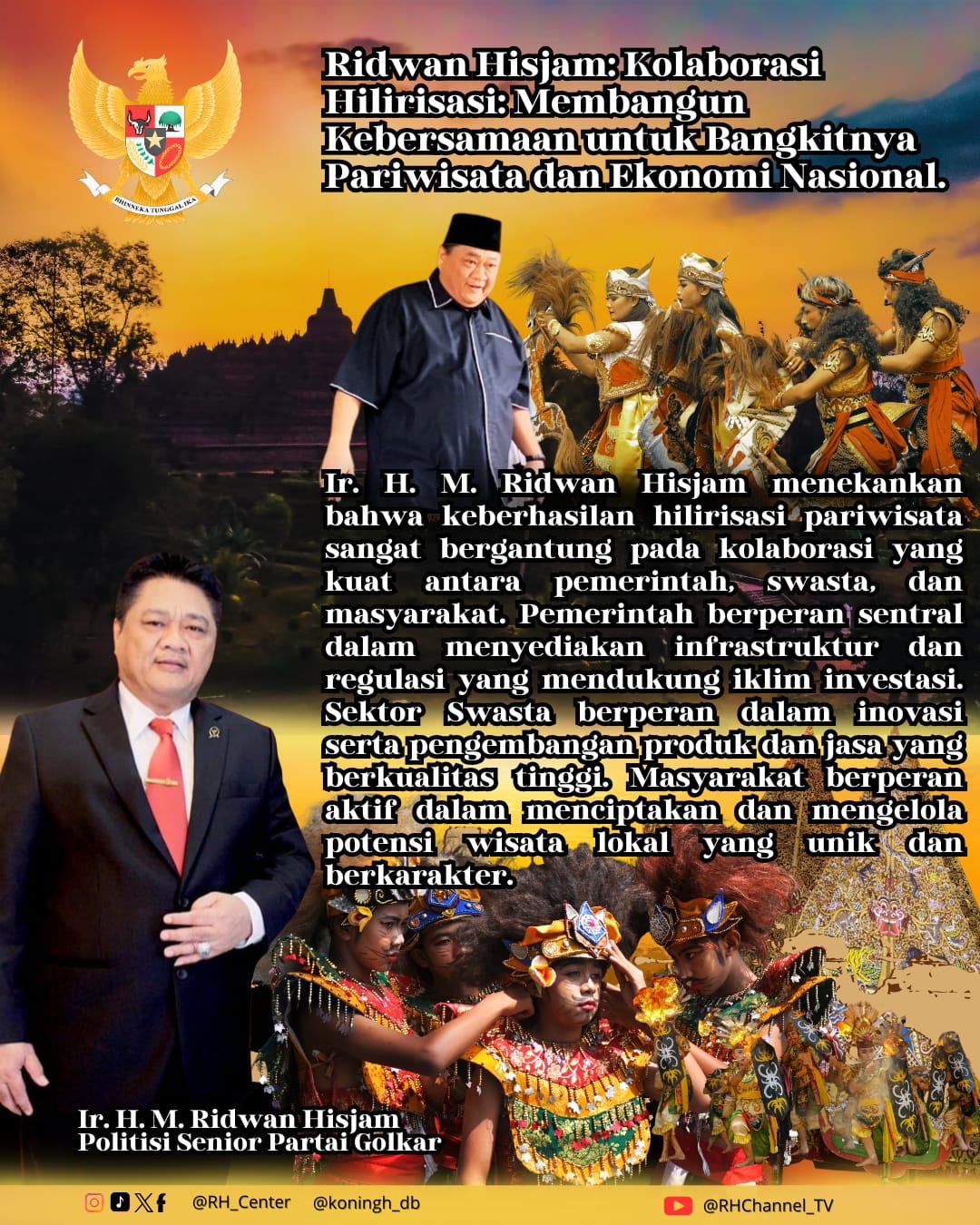Ir. H. M. Ridwan Hisjam menekankan bahwa keberhasilan hilirisasi pariwisata sangat bergantung pada kolaborasi yang kuat antara pemerintah, swasta, dan masyarakat. Pemerintah berperan sentral dalam menyediakan infrastruktur dan regulasi yang mendukung iklim investasi. Sektor Swasta berperan dalam inovasi serta pengembangan produk dan jasa yang berkualitas tinggi. Masyarakat berperan aktif dalam menciptakan dan mengelola potensi wisata lokal yang unik dan berkarakter, Sabtu (11/04/2026).