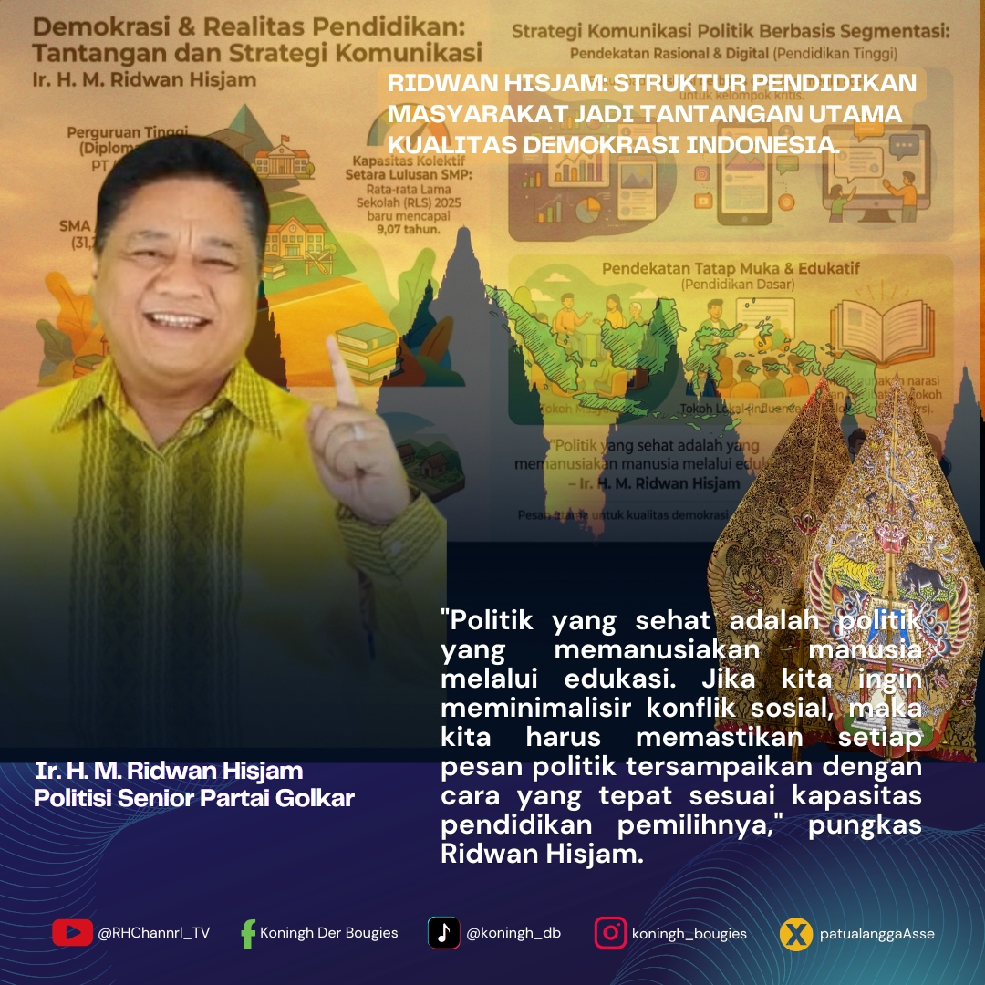Tokoh nasional dan pemerhati kebijakan publik, Ir. H. M. Ridwan Hisjam, menyoroti tantangan struktural demokrasi Indonesia yang berakar pada profil pendidikan masyarakat. Menelaah transisi data tahun 2024 hingga 2025, beliau menegaskan bahwa efektivitas komunikasi politik sangat bergantung pada pemahaman terhadap realitas literasi pemilih di lapangan.