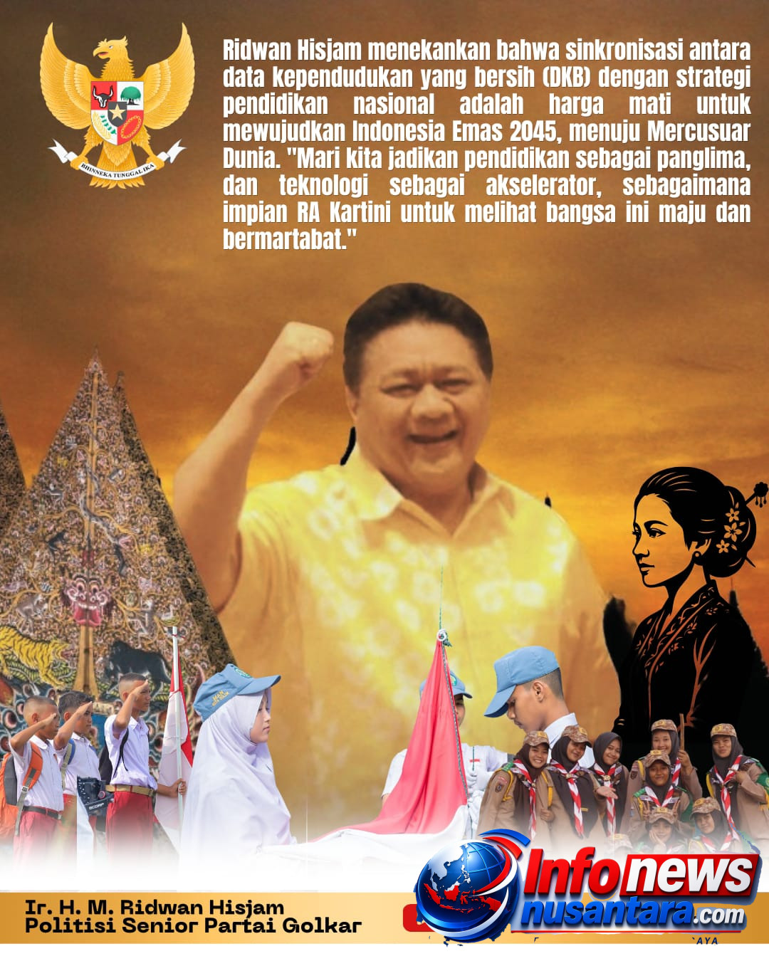 Ridwan Hisjam menekankan bahwa sinkronisasi antara data kependudukan yang bersih (DKB) dengan strategi pendidikan nasional adalah harga mati untuk mewujudkan Indonesia Emas 2045, menuju Mercusuar Dunia. “Mari kita jadikan pendidikan sebagai panglima, dan teknologi sebagai akselerator, sebagaimana impian RA Kartini untuk melihat bangsa ini maju dan bermartabat,” pungkasnya.