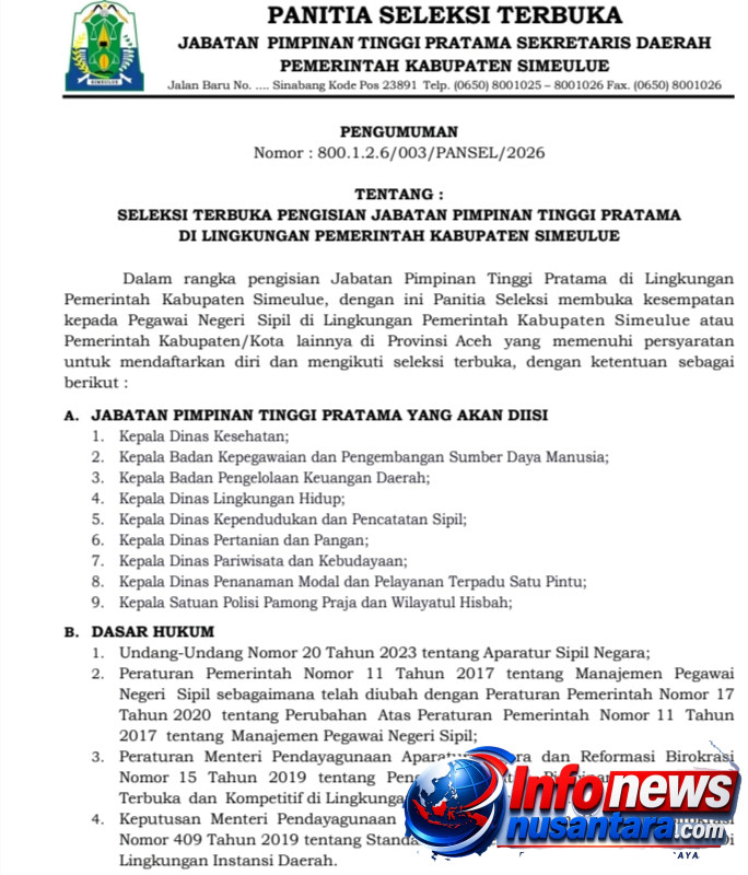 Pemerintah Kabupaten Simeulue melalui Panitia Seleksi resmi membuka Seleksi Terbuka Pengisian Jabatan Pimpinan Tinggi (JPT) Pratama Tahun 2026.