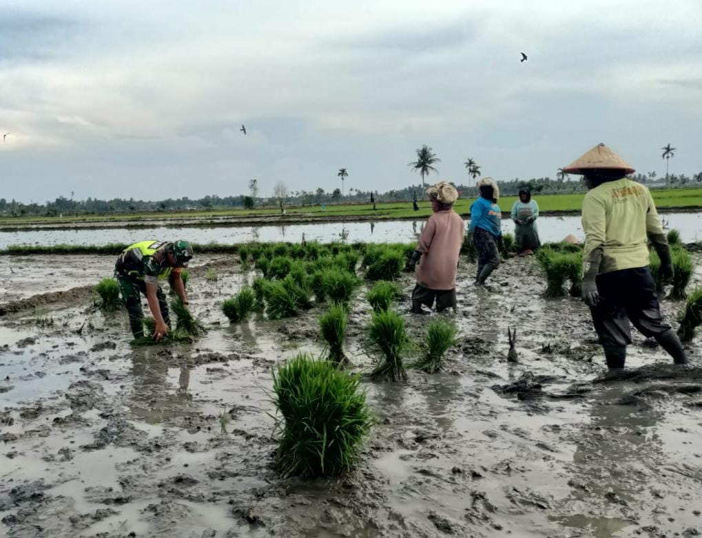 Serda Syukri Babinsa Koramil 11/Bandar Baru Kodim 0102/Pidie Laksanakan Pendampingan Tanam Padi di Desa Baro Nyong