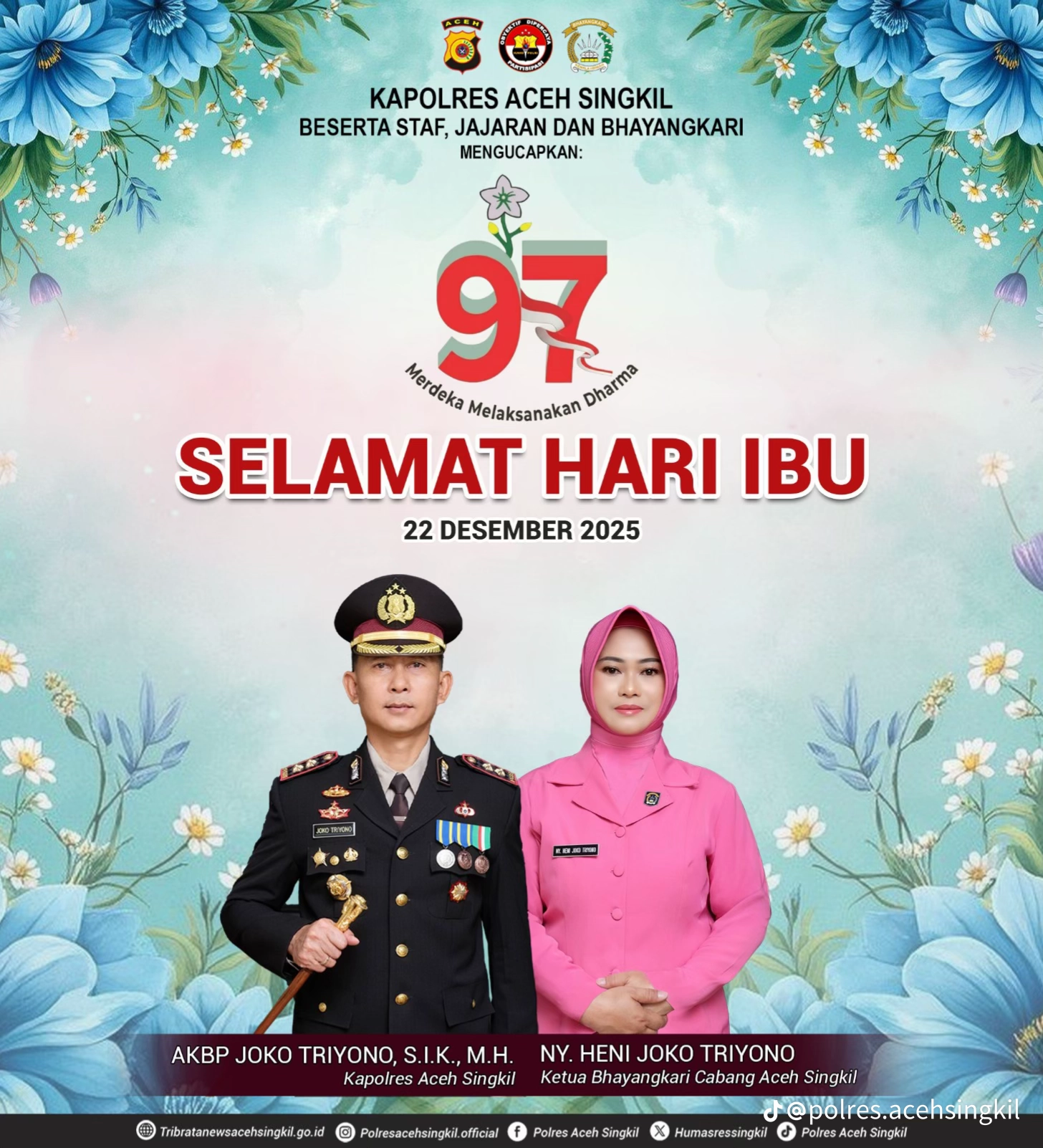 Aceh Singkil –infonewsnusantara.com Sosok Kapolres Aceh Singkil, AKBP Joko Triyono, S.I.K., M.H., dikenal sebagai pemimpin yang humanis, tegas, dan dekat dengan masyarakat. Dalam momentum Hari Ibu ke-97 yang diperingati pada 22 Desember 2025, Kapolres Aceh Singkil bersama jajaran dan Bhayangkari menunjukkan komitmen kuat dalam menghormati serta mendukung peran strategis perempuan, khususnya para ibu, dalam keluarga dan masyarakat.