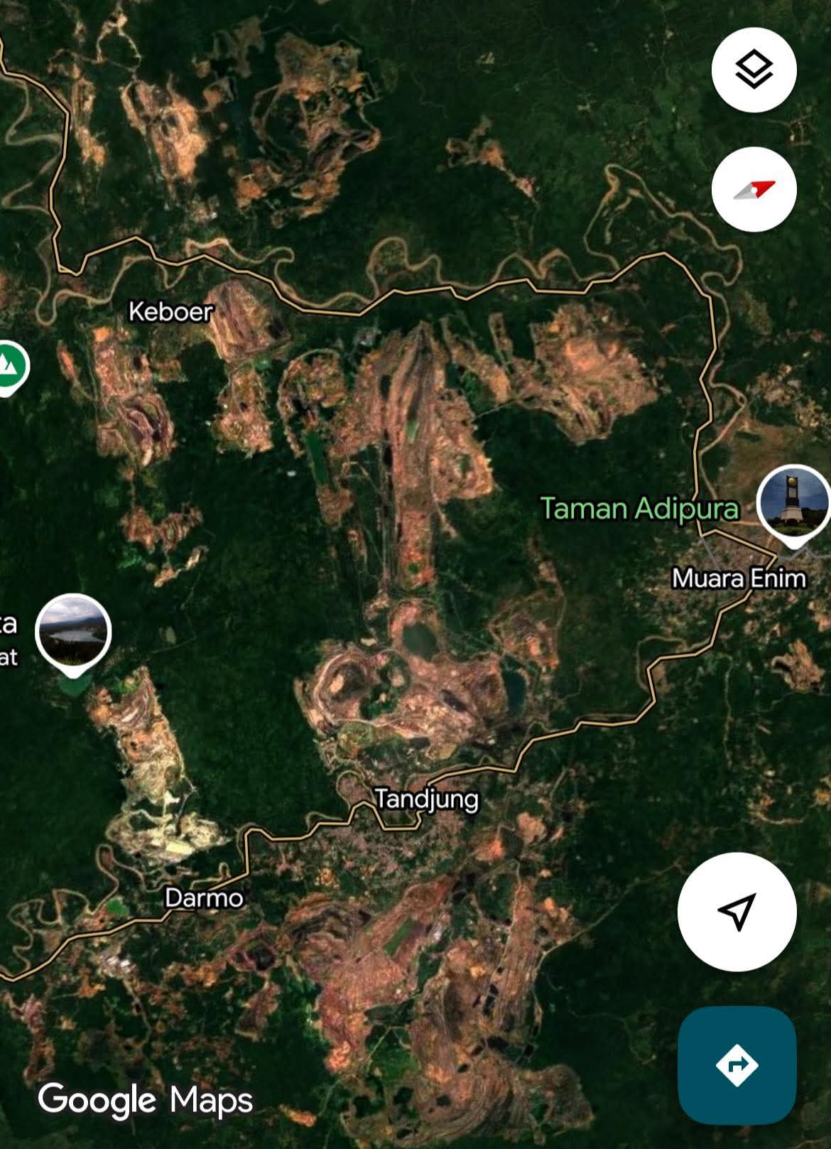 Kondisi terkini di Kabupaten Muara Enim dan Lahat, Provinsi Sumatera Selatan, kembali menjadi sorotan publik karena dampak lingkungan yang signifikan akibat aktivitas penambangan batu bara. Citra satelit dan Google Maps menunjukkan deretan lubang-lubang besar bekas galian tambang batu bara yang tersebar di banyak titik.