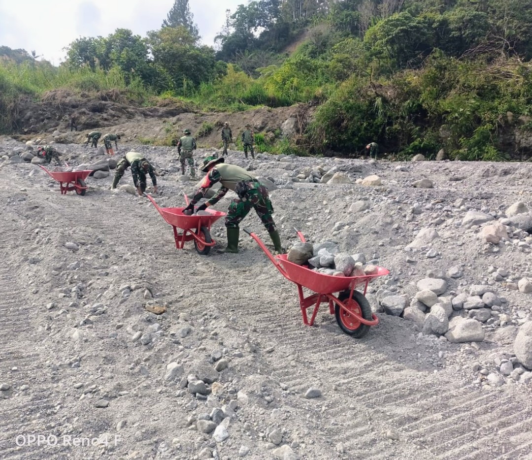Dalam kegiatan gotong royong tersebut, para anggota Satgas dan masyarakat secara bersama-sama mencari dan mengumpulkan batu untuk dijadikan pondasi dasar jembatan. Batu-batu tersebut disusun sebagai penguat struktur agar jembatan kembali kokoh dan dapat digunakan dengan aman oleh warga.
