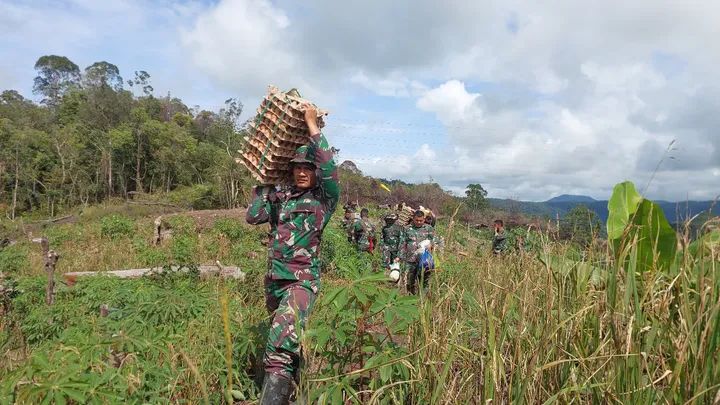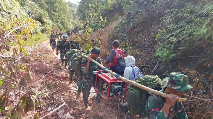 Pendorongan logistik dari Yonif 122/TS dan Yonif 125/Simbisa sebanyak 40 orang melaksanakan pergerakan dengan berjalan kaki menuju Dusun Lapan Lombu, Kelurahan Nauli, Kecamatan Sitahuis, Kabupaten Tapanuli Tengah, Provinsi Sumatera Utara, pada Sabtu (06/12/2025).